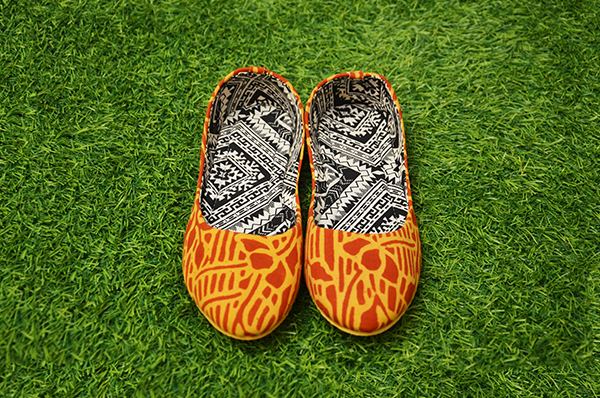 Know your Shoe – Engaging Red floral print on Deep Yellow base. Contrasting Black and White Native American print Fabric. The base Yellow colour comes from Your Household Haldi (Turmeric) Powder.
